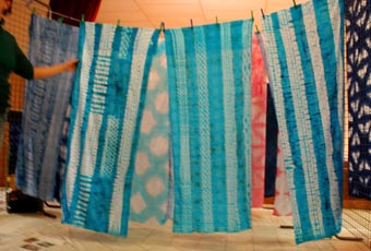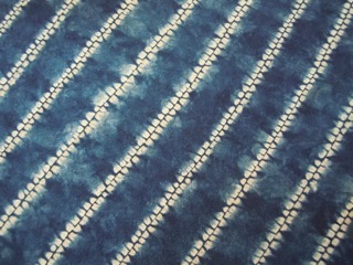 15.7.14 Après le martelage de feuilles à tanins, deuxième activité pour apprivoiser la teinture végétale naturelle, qui ne requiert pas un grand talent artistitique ni même une maîtrise des teintures de textiles: le shibori japonais, bien documenté, qui consiste à nouer, ficeler ou plier le tissu avant de le teindre, les noeuds, les fils ou les plis restant blancs alors que le reste du tissu sera teint.