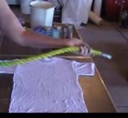 Version tshirt de l'arashi: sur cette video de TieDyeJudy (Rope Wrap Shibori Technique), on voit qu'elle a adapté la méthode en froissant un T-shirt sur un fin tuyau d'arrosage.