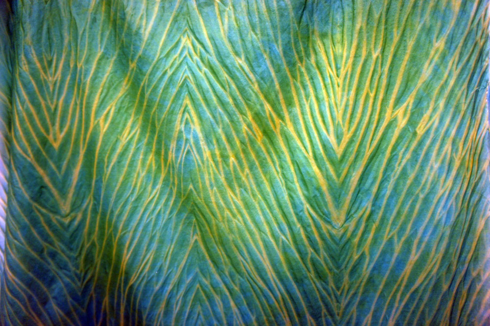 Ma technique favorite: froisser sur un tube pour obtenir des plis au final, qui se dit "arashi" en japonais et "pole wrapping" en anglais. Photo 1 extraite de la vidéo de Laverne Zabielski, photo 2 du blog SilkShibori