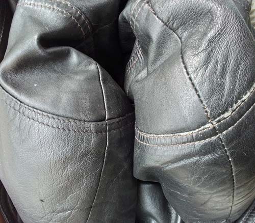 Après que l'une de ces vestes a été portée 3 ans quasi non-stop, elle mérite un petit coup de neuf. Une partie est grisée, un peu élimée. Une couture se défait. Cirer en noir ne suffit pas, ça s'estompe vite. Je vais dévernir ce qu'il reste, avec de l'alcool (plutôt que le deglazer de la marque, qui coûte cher). Puis je teindrai (teinture à l'alcool), le fil de couture noircira aussi j'espère. Dès que c'est sec, je masserai à la main avec mon regénérateur maison.