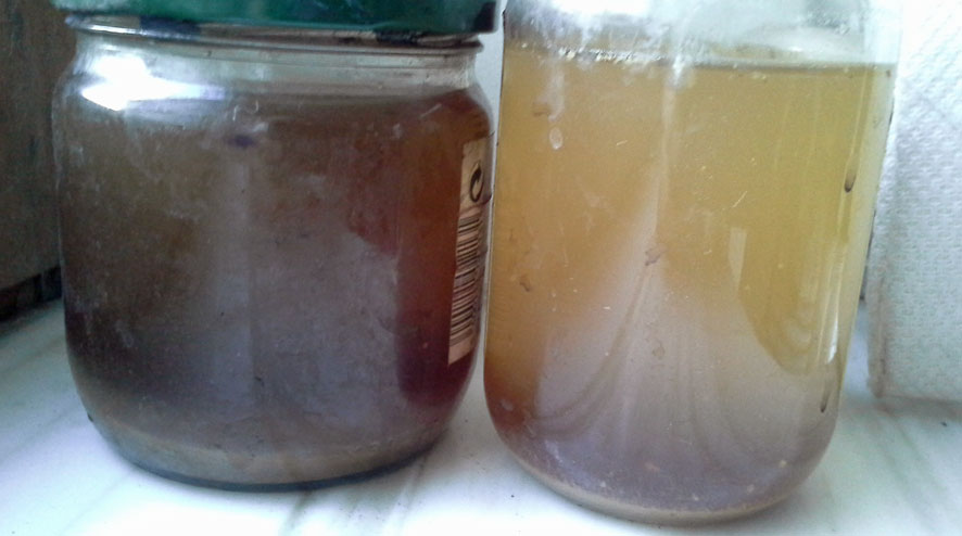 Lors de mes premiers pas en teintures naurelles, j'ai teint aux résidus, au marc de café. J'ai observé qu'en eau de distribution le ton était beige tirant sur le gris; en eau déminéralisée (récup' du séchoir ménager) le ton était d'un beau beige lumineux. J'en ai déduit que l'eau de distribution devait contenir un peu de fer, chez nous. Le café est riche en tanins, les tanins grisent lorsqu'ils rencontrent du fer. Voilà ce qui se passait dans ma teinture... Désormais, j'utilise l'eau déminéralisée dès que je teins avec une plante qui risque de contenir des tanins.