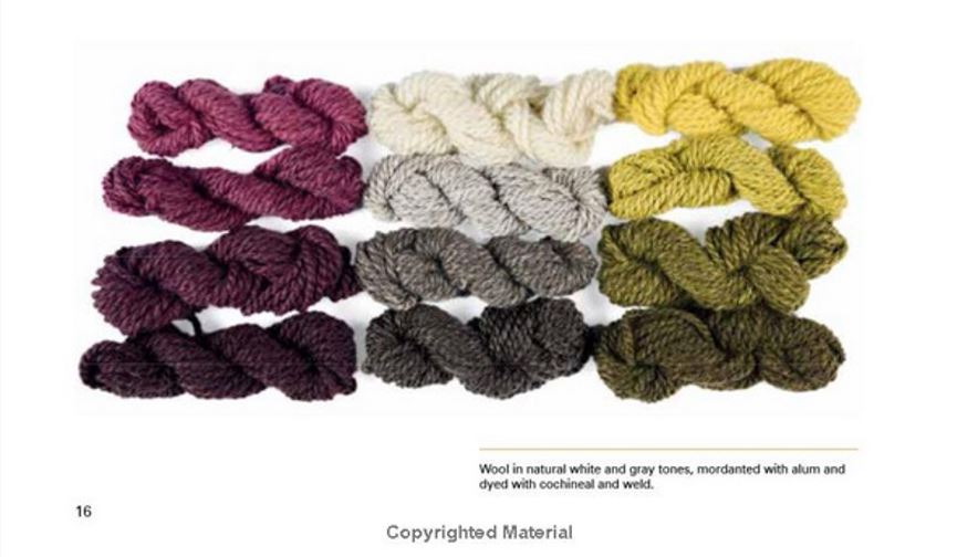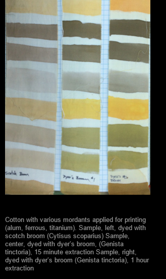 L'image montre l'effet de divers mordants. L'auteur montre aussi qu'elle s'est trompée en plantant dans son jardin du genêt ordinaire (cytisus scoparius), qui ne donne que de pâles jaunes (colonne de gauche). Depuis qu'elle les a remplacés par des genets du teinturier (genista tinctoria), les résultats sont plus lumineux. C'était une confusion de genres.