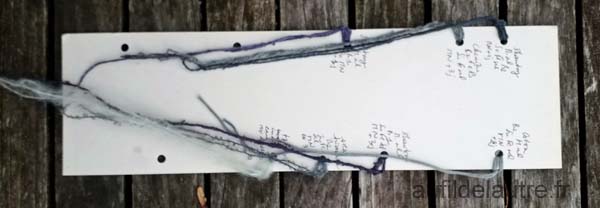 Lorsque je veux procéder à une série de test sur tissu ou sur écheveau, je garde les mêmes codes pour chaque colorant (campêche, cachou, garance, cochenille, gaude, orcanette). Cette numérotation m'aide pour m'y retrouver ultérieurement, ça va devenir un standard. J'étiquette en tyvek chaque test, je note au marqueur indélébile. Un numéro est plus simple qu'un long discours.