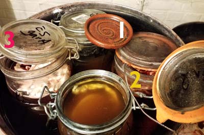Dans ce cas-ci, je voulais comparer la prise de teinte avec eau de distribution ou eau déminéralisée, avec ajout de craie ou non - ce qui me fait quatre bocaux de tests.