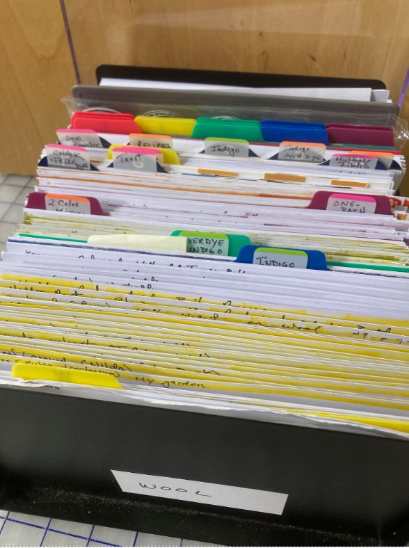 En photo un exemple de méthode d'archivage, chez Catharine Ellis, dans son article "Utiliser mes fiches de recettes" (ce qui est une façon détournée de vous présenter une des grandes dames de la teinture):