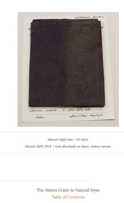 Août 2014. Au cours du stage NL, Michel Garcia ajoutait aux bains de teinture 10% de tannins galliques, pour augmenter la résistance lumière. Ses tests labo, montrés lors de sa présentation powerpoint, montrent une belle résistance lors d'ajouts de tannins galliques - en tout cas sur gaude, garance, chataigner, myrobolan etc (plus léger pour campêche, qu'il a testé sans cachou ou bouleau, je crois). J'ai pris l'habitude faire pareil, parfois simplement en rajoutant une série d'infusettes de thé épuisées, sources de tanins. Surtout pour mes rouges.