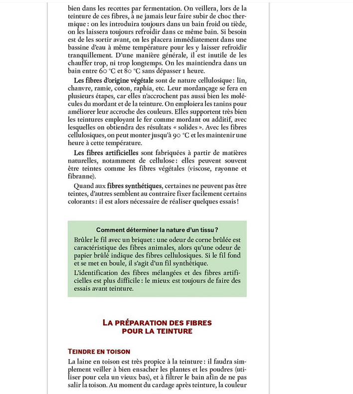Pour ce contexte, la fibre doit être mordancée ou pas, cela dépend du procédé à tester: en monobain acide, la laine et la soie ne sont pas mordancées au préalable; en cachou ou noyer, le coton et le lin ne le sont pas non plus
